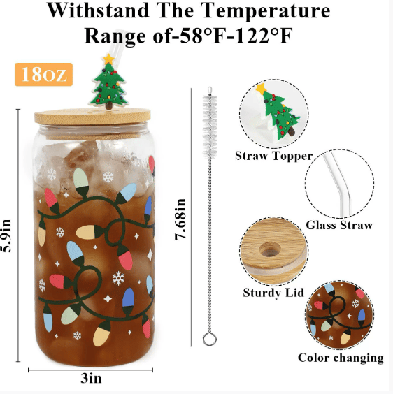 The perfect 18oz size for iced coffee, smoothies, cocktails, or holiday punches.Includes a reusable glass straw and adorable straw charm for extra festive flair.
